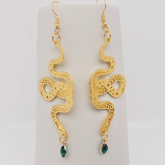 Bohemian Star Moon Snake Earrings Green Crystal Pendant