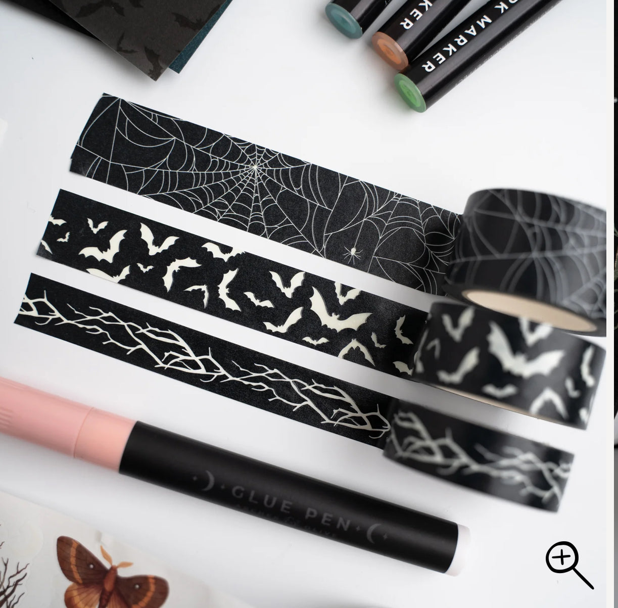 Glow-in-the-Dark Washi Tape Set (3 rolls) – Spiderwebs, bats, and branches that shine after dark