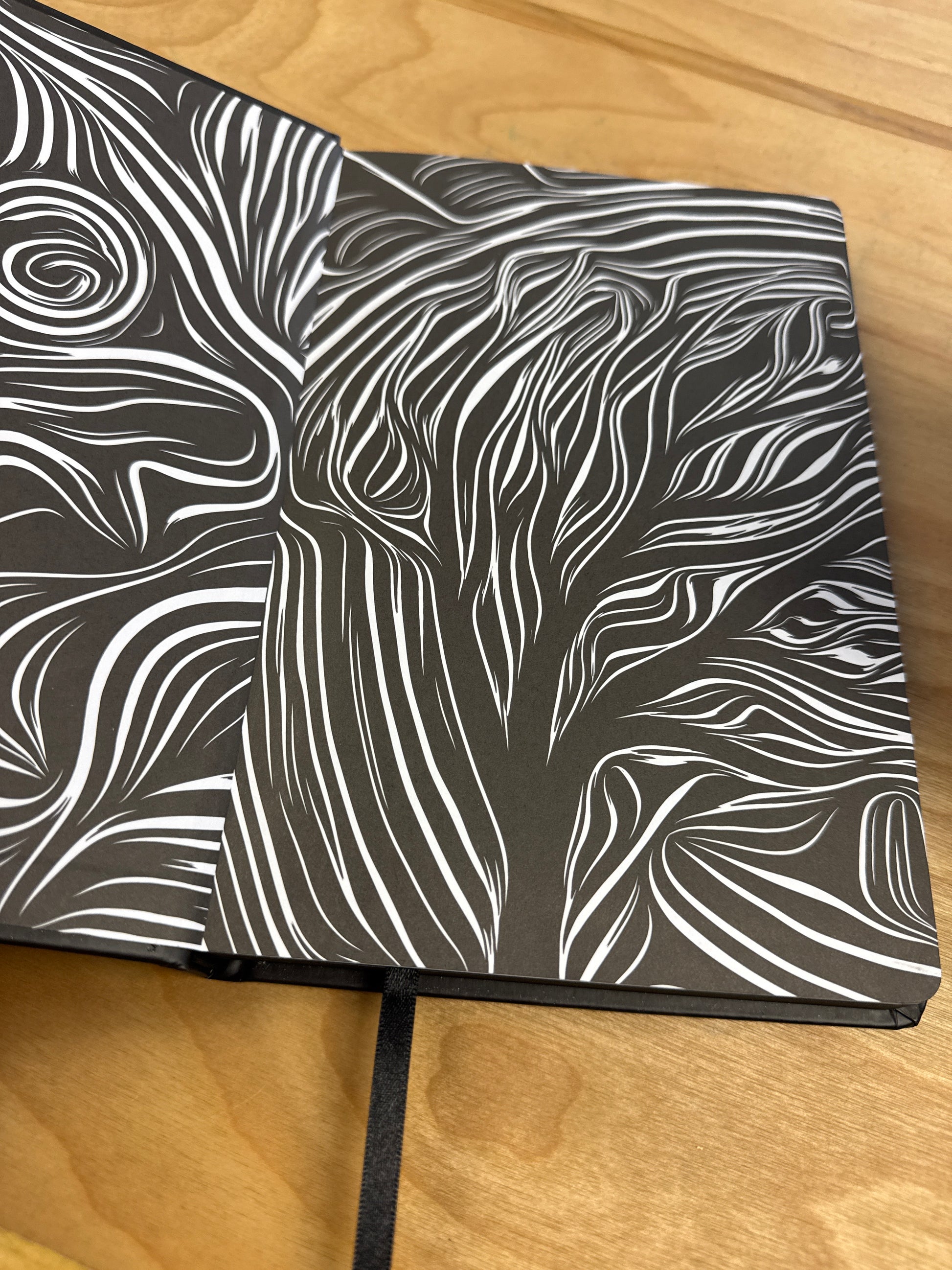 Foil-embossed cover, matte black edges, stunning end papers, a decorative headband, and black satin ribbon bookmark