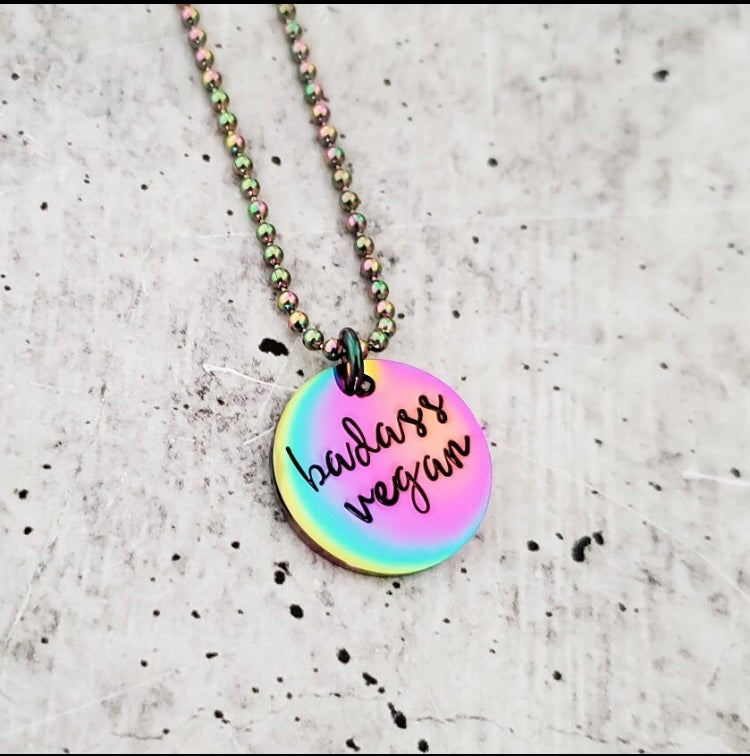This colorful hand-stamped jewelry piece includes a fun vegan-loving phrase in script or print font in vegan ink with the words “badass vegan”