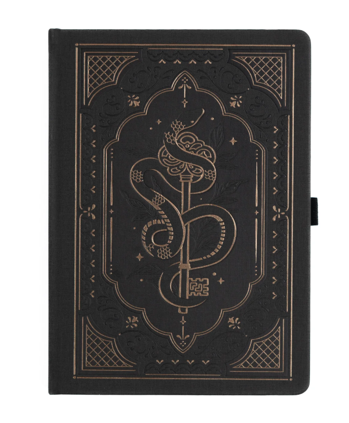 Featuring a gold-foil snake slithering seductively around a vintage key on sleek black vegan leather.
