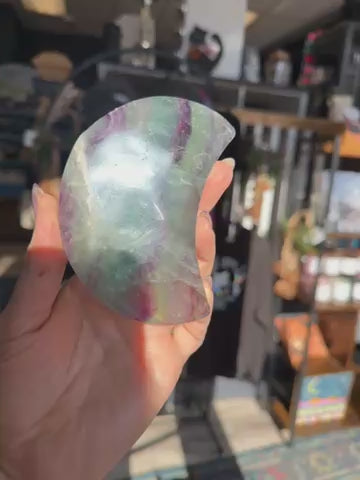 This crescent moon 🌙 is carved from beautiful rainbow 🌈 fluorite. It captures rainbow flashes in its colors of greens blues and purples.