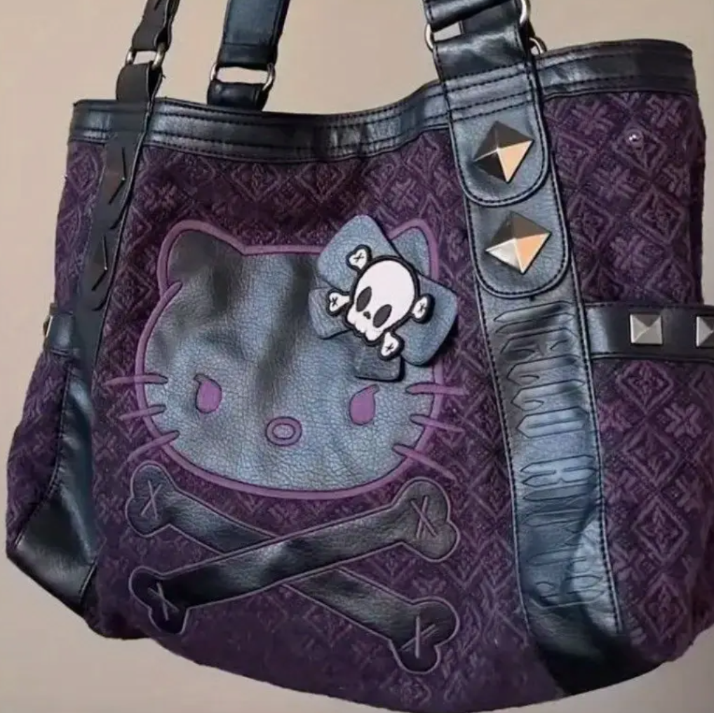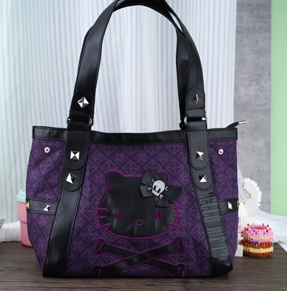 Turn heads with this Goth Hello Kitty Tote, a wickedly cute black and purple bag that’s more than just a pretty face.