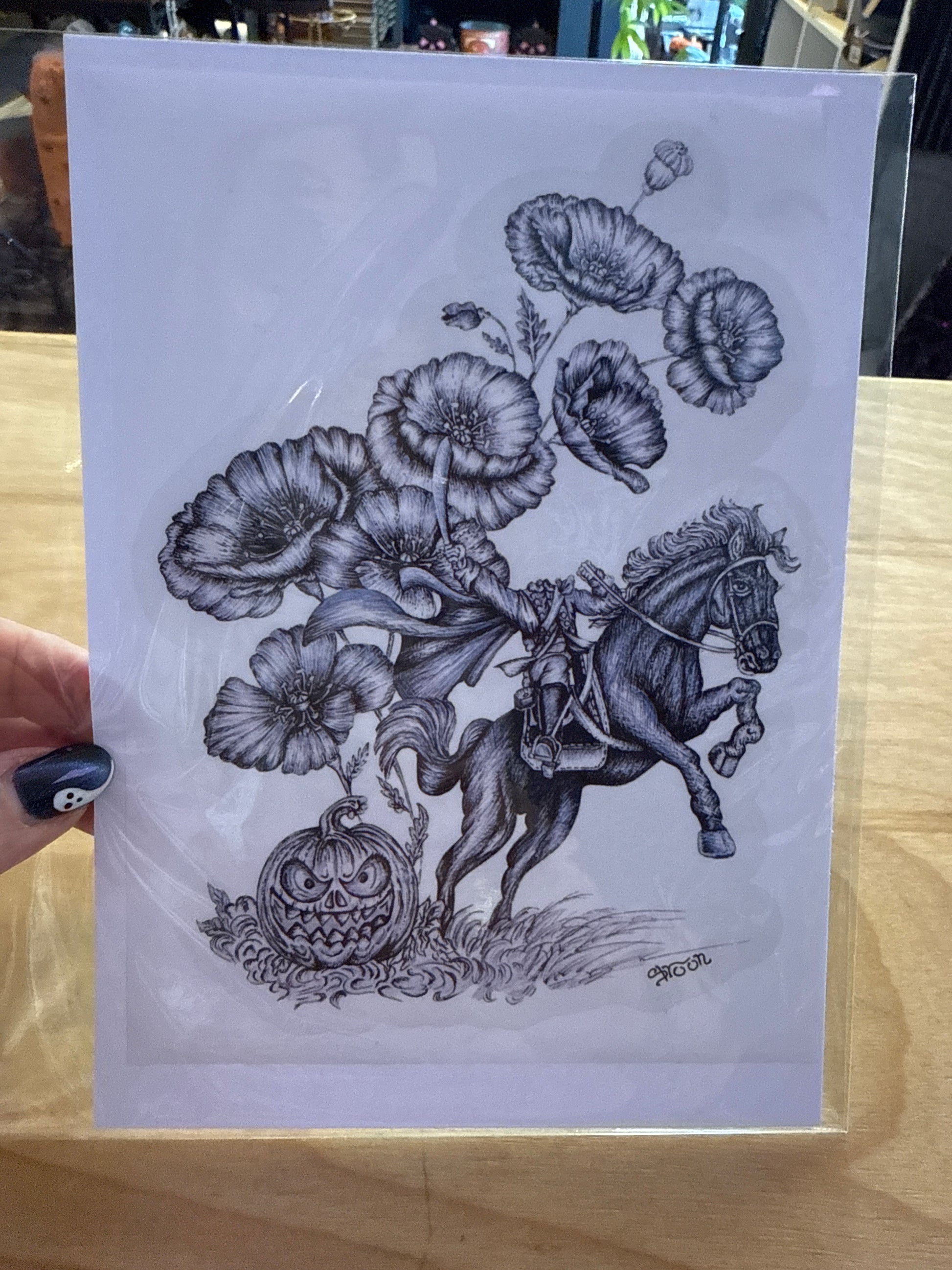 Introducing the Headless Horseman Water Bottle Wrap Sticker, featuring high quality vinyl and hand-drawn art by local artist Shroon.