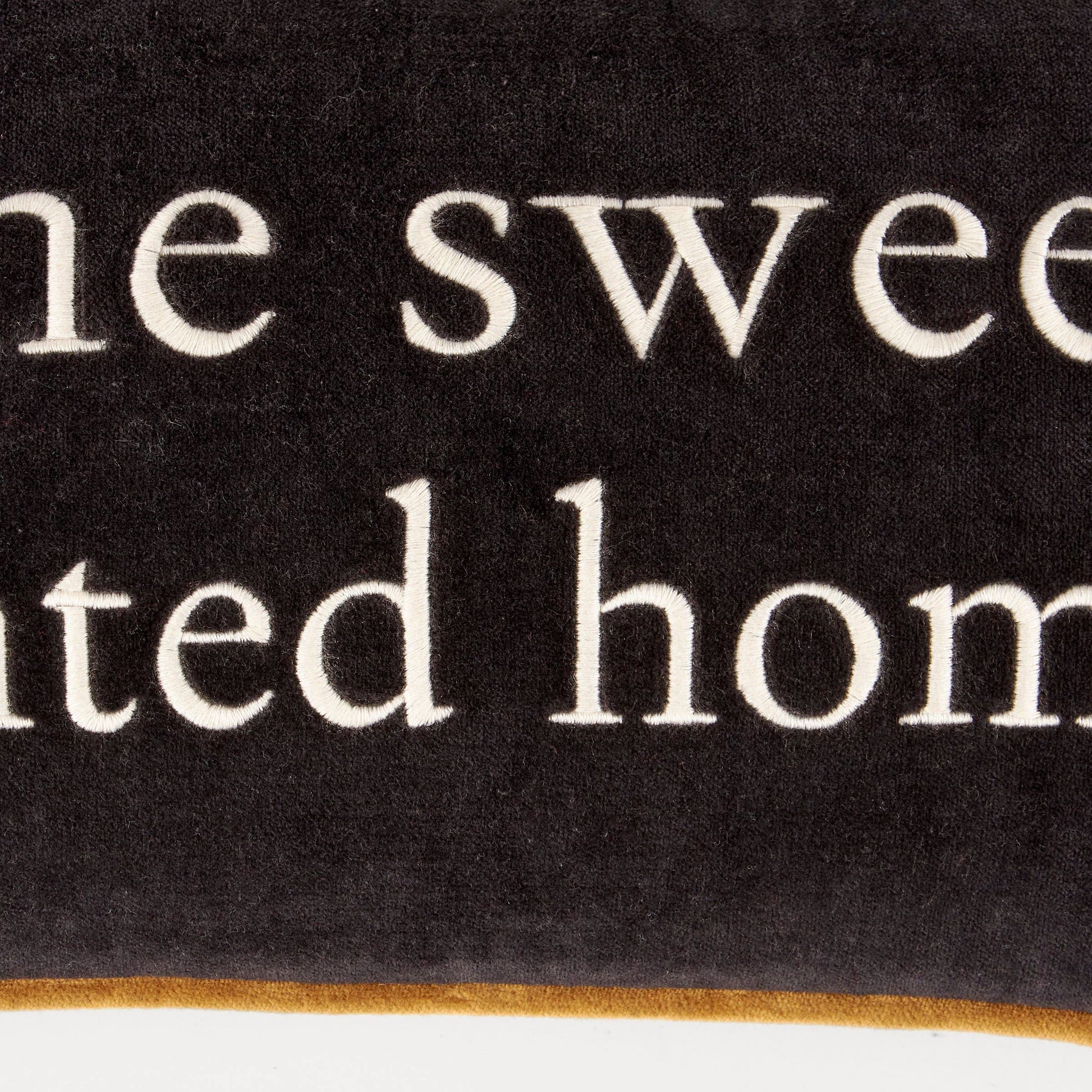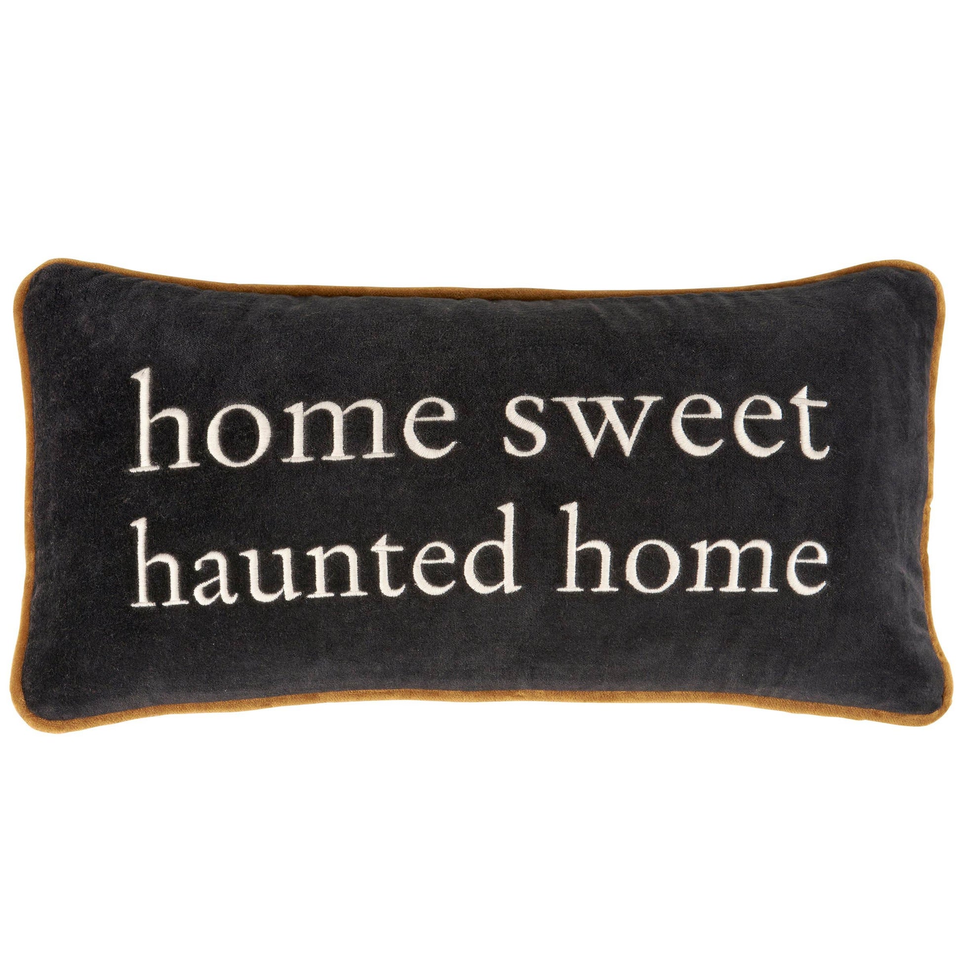 A decorative cotton pillow from our Halloween Collection displaying a fun Halloween-themed sentiment that reads "Home Sweet Haunted Home" embroidered on black velvet. Pillow features coordinating black velvet on back with orange piping trim. Our Home Sweet Haunted Home pillow includes a zipper to easily remove and clean machine-washable pillow cover. Contains polyester filling and is shipped vacuum-sealed for protection and storage. A fun seasonal home accent perfect for any room.