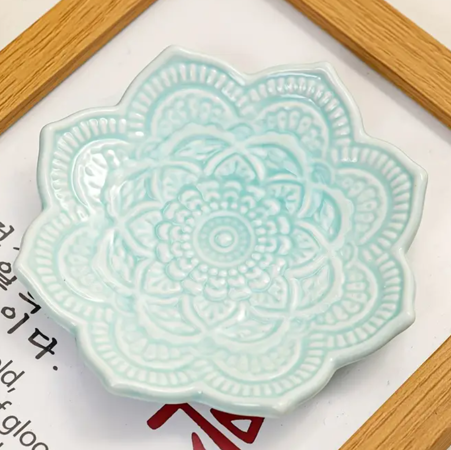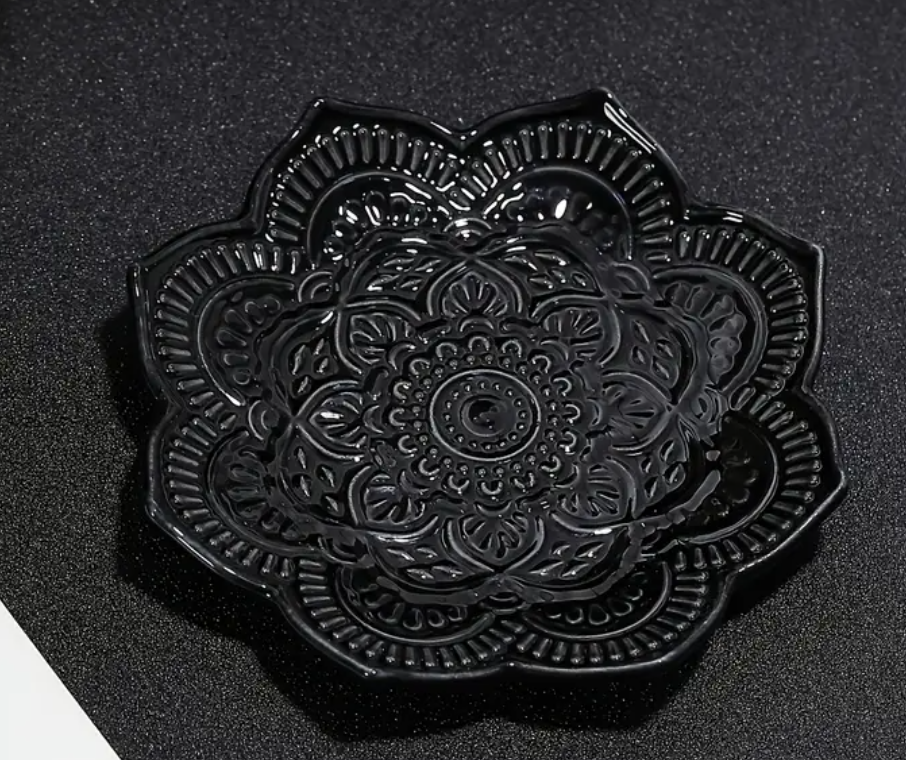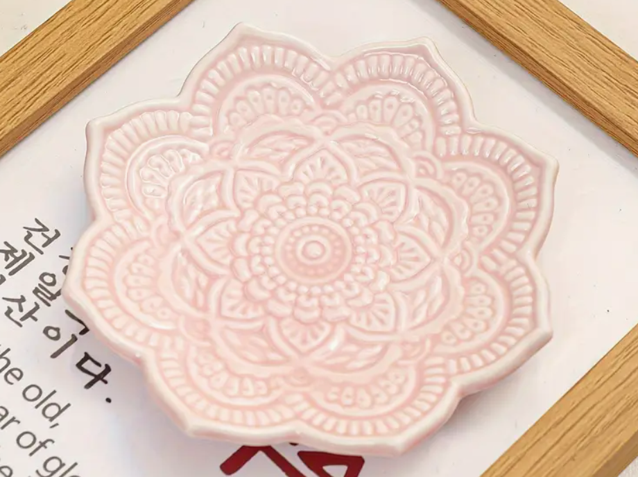 This ceramic dish features a detailed mandala design, making it a beautiful addition to any vanity or dresser.