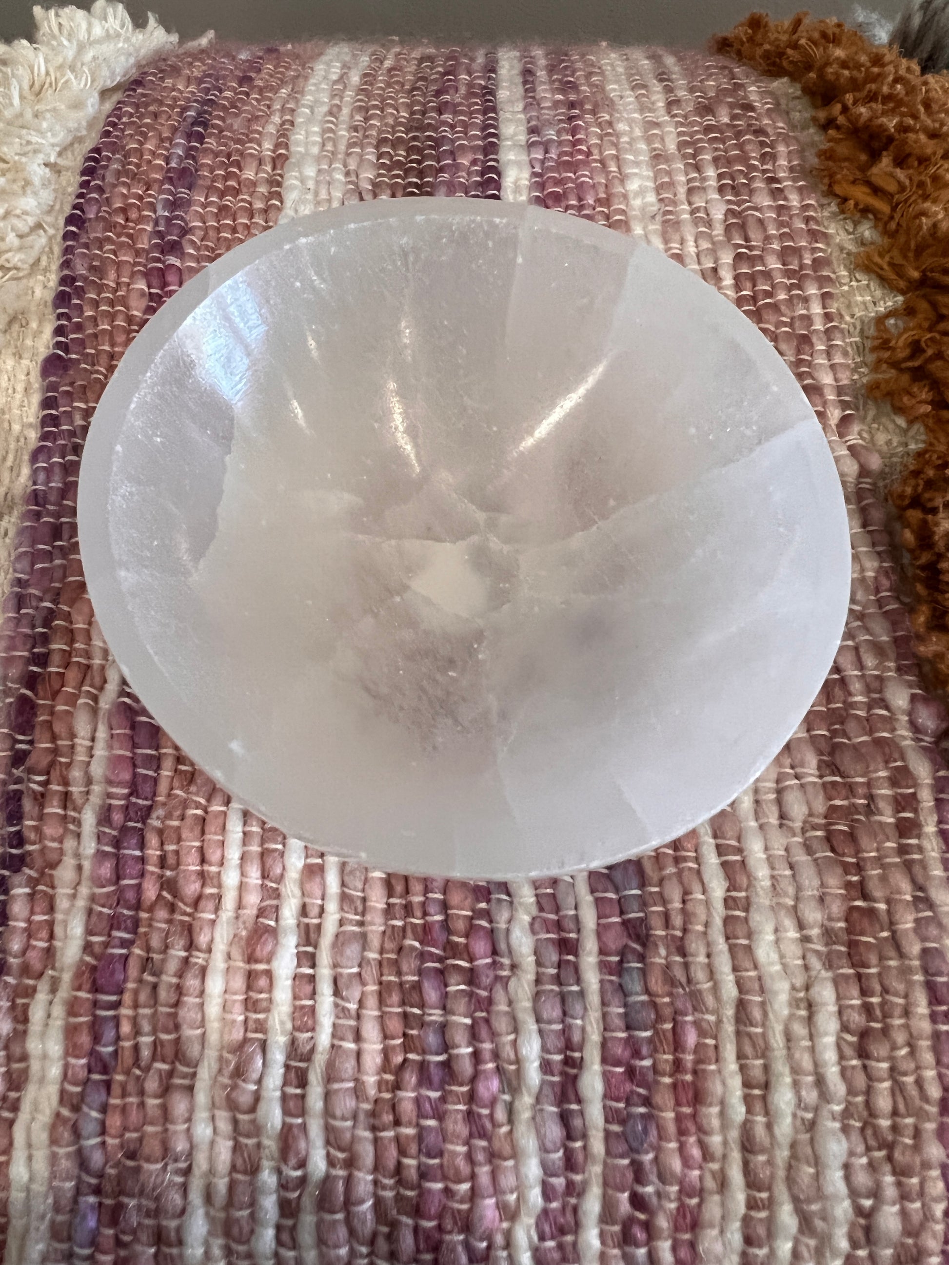 100% Natural Moroccan Selenite hand-carved into decorative bowl.