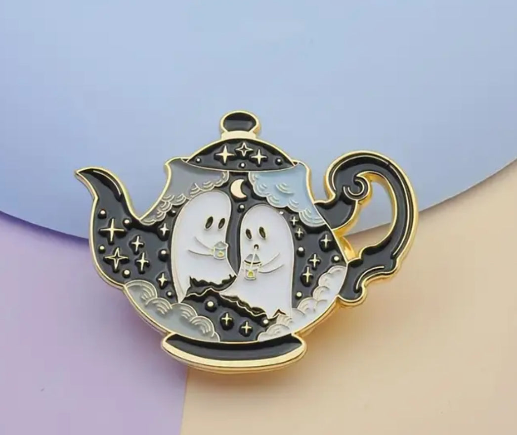 This playful accessory features a black and white gothic design with golden accents, perfect for adding a touch of magic to your teatime.