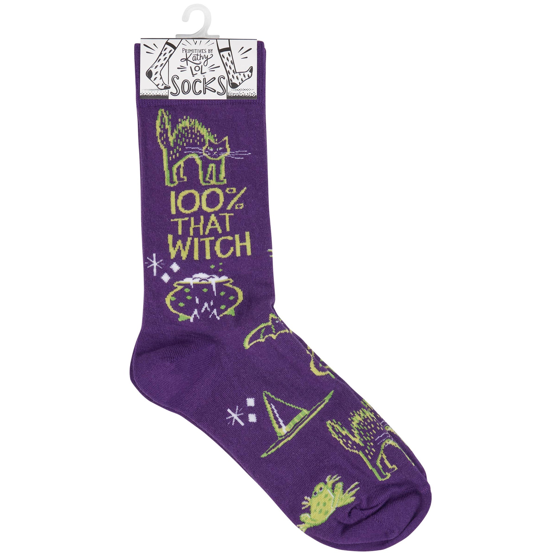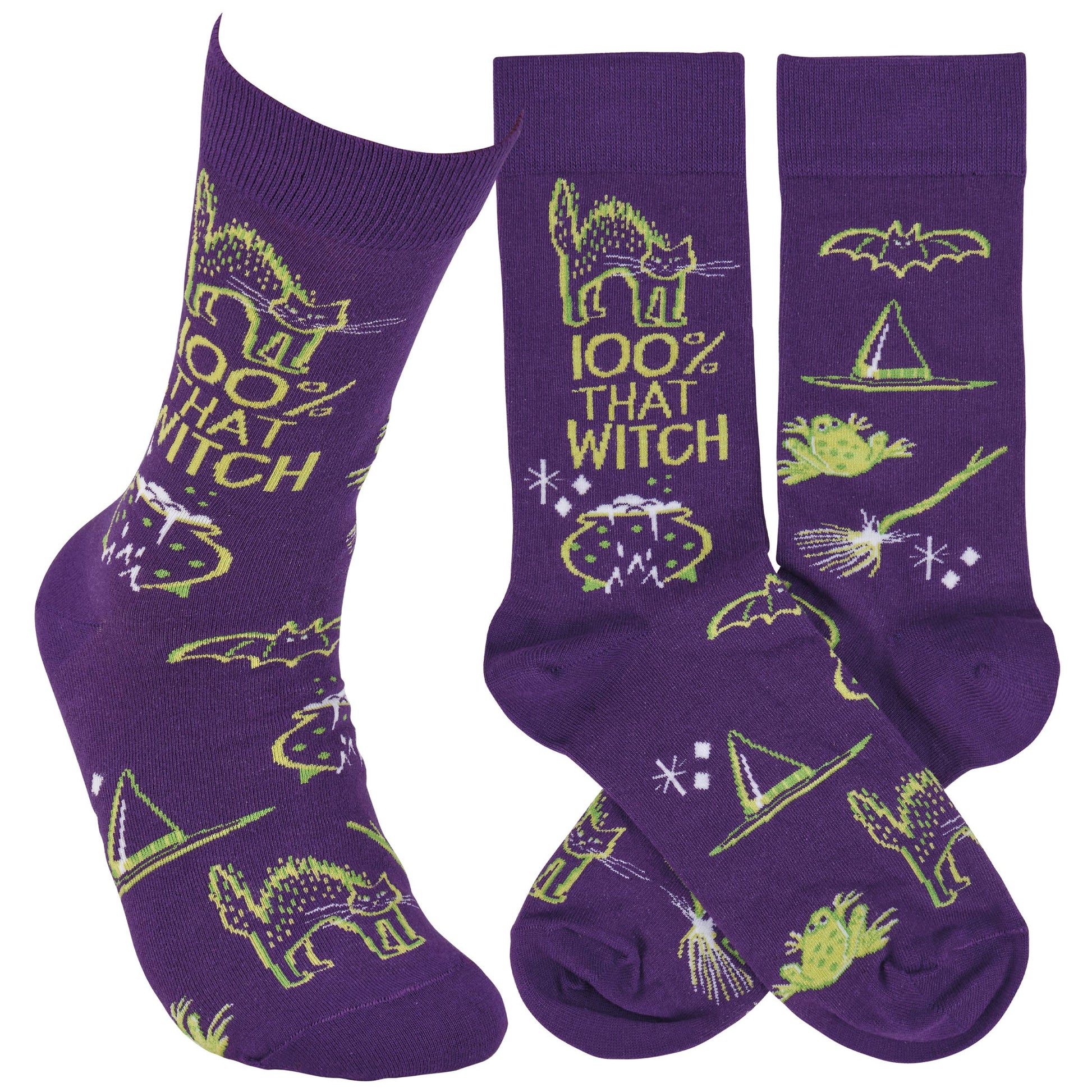 A pair of colorful socks from our Halloween Collection displaying unique hand illustrated designs of witch motifs in purple and green with a fun seasonal sentiment that reads "100% That Witch." Seasonal socks feature a one size fits most design made with cotton, nylon, and spandex. Our That Witch socks come with a header card and a clear plastic hanger for display. A fun Halloween-themed gift perfect for seasonal self-expression.