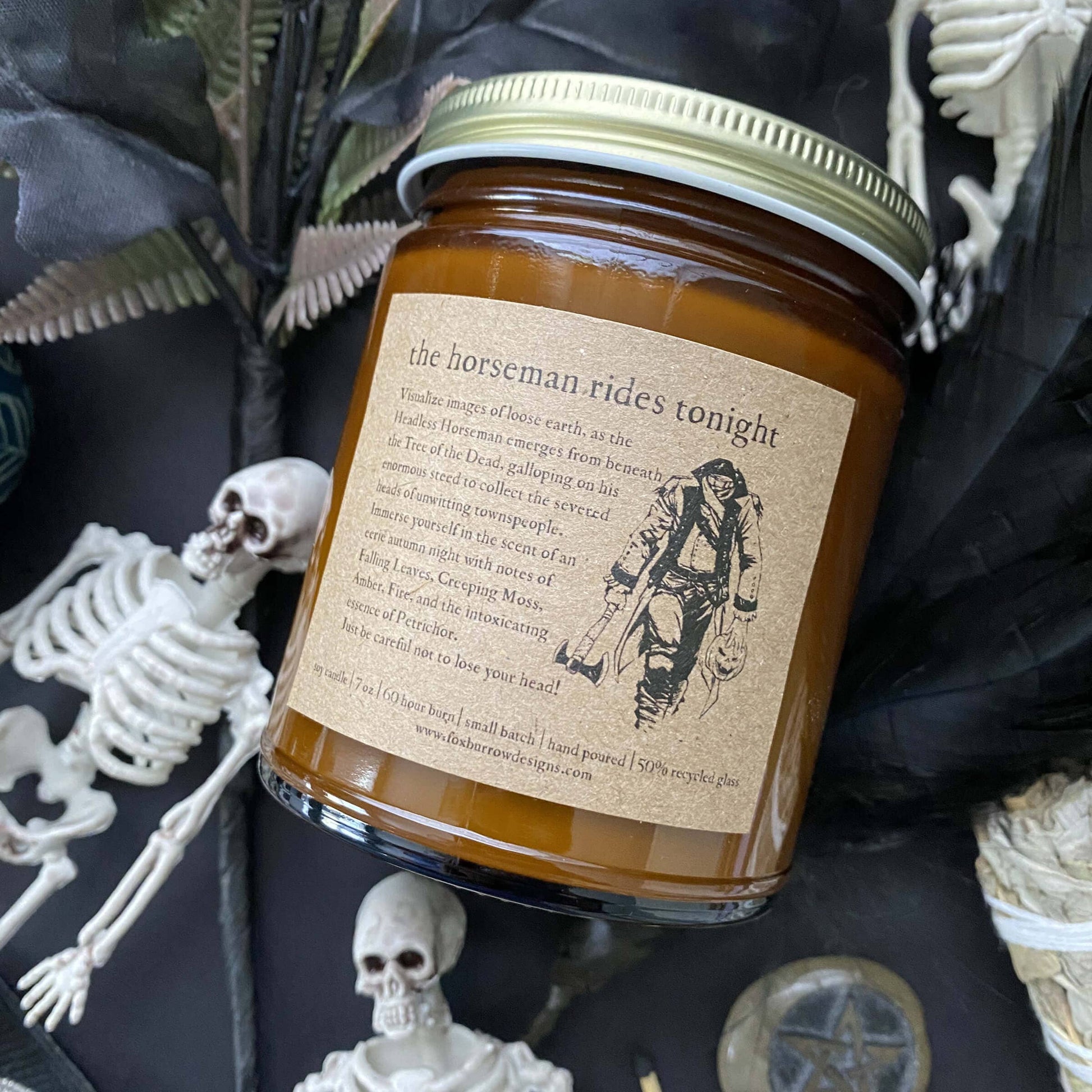 Visualize images of loose earth, as the Headless Horseman emerges from beneath the Tree of the Dead, galloping on his enormous steed to collect the severed heads of unwitting townspeople. Immerse yourself in the scent of an eerie autumn night with notes of Falling Leaves, Creeping Moss, Amber, Fire, and the intoxicating essence of Petrichor. Just be careful not to lose your head!
